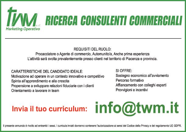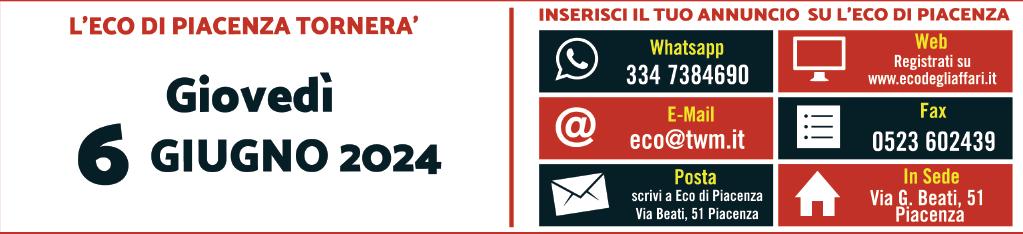 07 n ° 0 9 - 2 3 m a g g i o 2 0 24 AVVISO AI LETTORI L Eco d P acenza o f e esc us vamente un serviz o non r ceve compens nel e con ra az oni non e etua commerc non è esponsab e per a qua à p oven enza e er d c à del e nserz oni L ed tore de L Eco d P acenza s rserva d i o d mod f care r u are o sospendere un nse z one a propr o ns ndacab e g ud z o L Ed ore ha a aco tà di abbrea e i odo e g b e talu e pa o e e d a a e a fo a de es o L Edito e non è enuto a spet are presc z on d data per odic tà o co ocamen o n qualunque ord ne anche consuetud na io né ad amme te e esc us one d g orn e neppure e sospens oni o sos tuz on L Edi o e non r sponde per eventua d p d s t d p bb d s i pe qua s as mo vo Non è neppure responsab per eventua er or d s ampa G inse z on s dovranno r onde e Edi o e ogni spesa even ualmente da esso soppor ata n segu o a mantes dich a az on v o az on d d r t ecc a causa del annunS p h i t h t d ff t d avoro debbono ntende s r e i e a persona e s a masch e sia emm n e essendo v e a a a sens de a t 1 egge 9 12 77 n 903 qua s as d scr m nazione fonda a su sesso pe quanto rgua da accesso a avoro nd penden emen e da le moda tà d q q t d t à È v e a a a r p oduz one o a e o parz a e d tut es d segn le oto r p odo e su ques o numero d g orna e Manosc i d segn o o anche se non pubb cat non vengono res tu Tu t d r t sono r servat NFORMATIVA PR VACY Chi n enda pubb icare un annunc o su L Eco di P acenza dovrà esp e e esplic ta e e l co se so a t a ta e to de da pesona e da i par ico a i cos come prev sto a sens deg i a t co 12 e ss de Rego amento (UE 2016 679 (GDPR) barrando la case a seguente ACCONSENTO AL TRATTAMENTO DE DAT PERSONAL L n orma va comp e a su t a tamento de dat e sul a Pr vacy è consul ab e p esso a sede de Ed to e TWM sr v a Beat 51 ( erzo p ano) – 29122 P acenza – Te 0523 610912 Sarà semp p ib l d p p d t d ma a eco@ wm