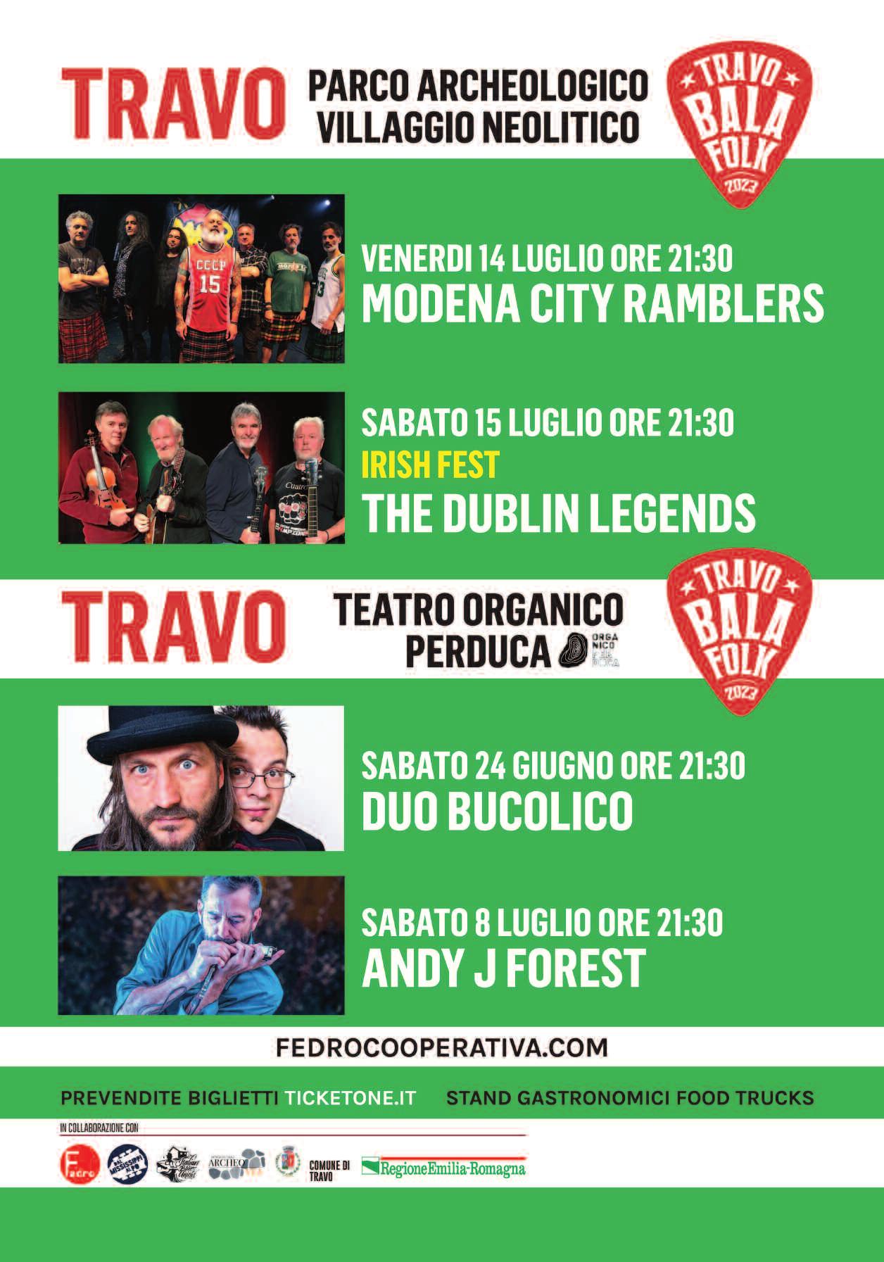 Tor na, Tra vo Balaf olk , f estival musicale realizzat o dagli “Amici del Castellaro” in sinergia con “Cooperativa Fedro” - Dal Mississippi al Po - e in collaborazione con il Comune di Travo Si r ipar t e al Parco Arc heologico V illaggio Neolitico con, sabato 8 luglio, Andy J Forest (concer ti dalle 21:30), venerdì 14 luglio Modena City Rumblers e sabato 15 luglio The Dublin Legends (concer ti dalle 21:30)