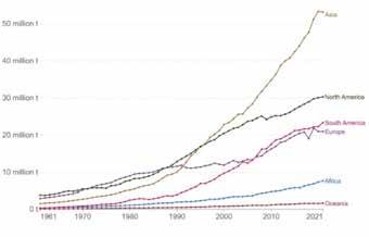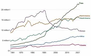 late). Entro il 2013, la quota dell'Europa e del Nord America era scesa al 19 e al 15%, in termini assoluti si parla di 58,18 milioni e 55,88 milioni di tonnellate.