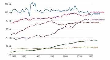 L’Africa, come mostra chiaramente il grafico, non vede nessun cambiamento rilevante nell’arco di 60 anni, con un consumo annuo di carne che nel 2020 conta “solamente” 16 kg. Questo dato fa emergere un tema estremamente rilevante di natura economica, che verrà trattato successivamente, ovvero il concetto di ricchezza legata all’assunzione e consumo di carne (Food and Agriculture Organization of the United Nations, 2023).