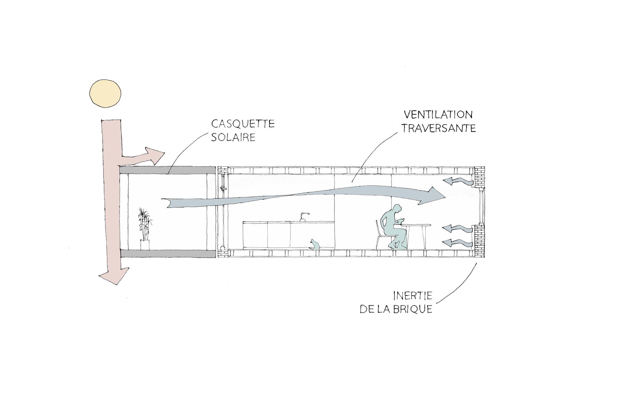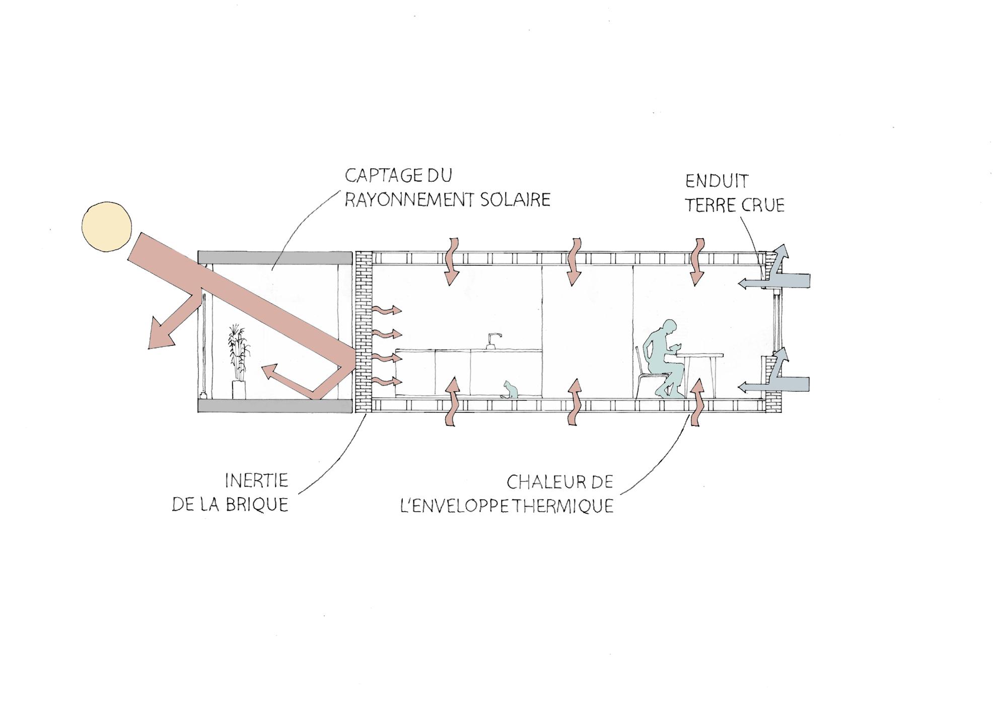 Pour éviter les surchauffes estivales, nous utilisons par ailleurs des mur intermédiaires en argile, et des planchers avec forte inertie (mélange d’argile et de bois). Nous profitons de l’emplacement des escaliers pour mettre en place un système de ventilation type «atrium». Enfin les toits végétalisés et les filtres naturels (végétations caduques au rez-de-chaussée) participent à limiter les surchauffes.