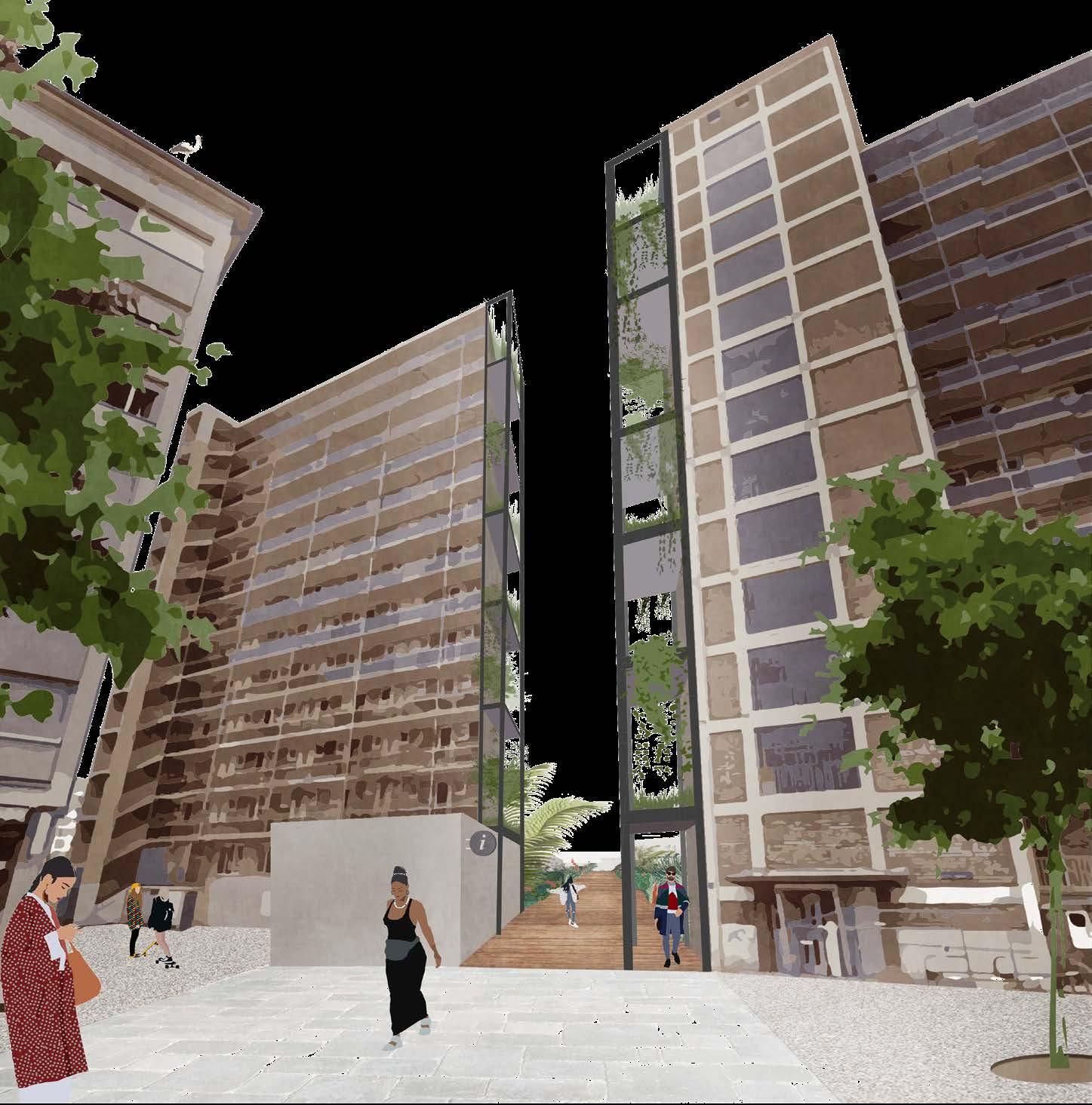 Ces interventions développent les activités communes tout à la fois dans la verticalité de la cité (jardins suspendus) que dans l’horizontalité (places communes).