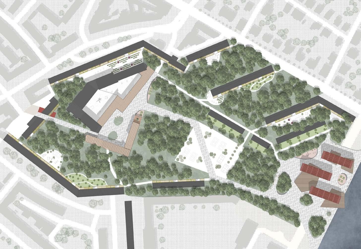 Le projet considère le site comme un ensemble d’espaces individuels interconnectés et non comme un tout. Ainsi, en fonction de l’usage déjà existant des différents lieux, plusieurs zones ont été aménagées et/ou requalifiées : espace de rencontre et de détente, friche sauvage, prairie fleurie, forêt de puit carbone, espace de déambulation et de promenade, zone nourricière et productrice...