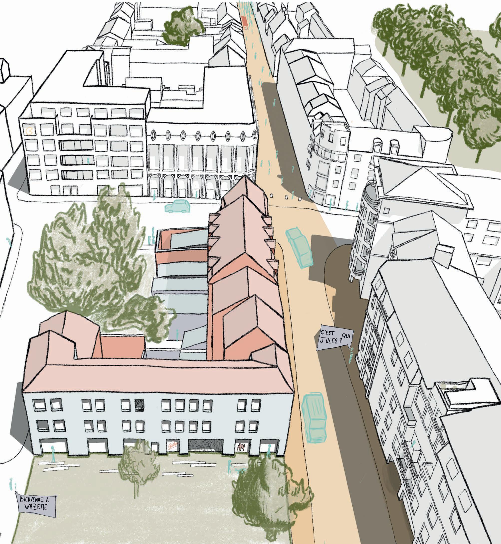 Mon intervention se concentre sur l’îlot Iena-Guesde, constitué de maisons de ville “1930”, formant un élément clé du paysage urbain. Loin de proposer un projet complètement fini, je propose une initialisation, une structuration, et un scénario de développement possible. C’est donc une réponse phasée dans le temps et dans l’espace, pour coller au plus près des réalités foncières et sociales du quartier.
