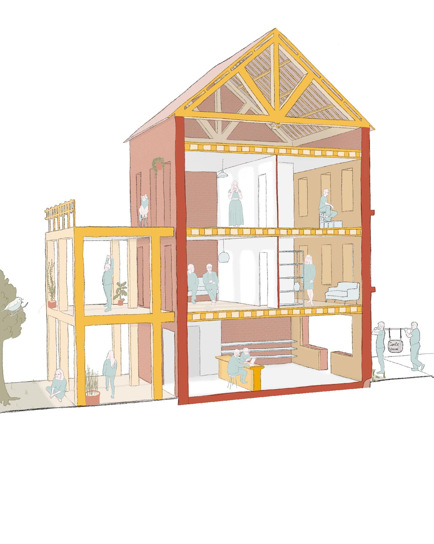 La première étape, possible dès aujourd’hui, vise à mobiliser et fédérer les habitants autour d’un projet commun. Pour cela, je propose l’occupation temporaire du 89 rue Jules Guesde au profit de l’association IRIS, association d’insertion implantée dans le quartier depuis des années. Cette occupation sera alors l’occasion de proposer des formations liées au métier de la construction. Des ateliers de prototypage et de construction sont donc mis à disposition des habitants. Une fois implanté dans le contexte local, il devient envisageable et possible de co-réhabiliter ensemble les maisons vieillissantes. Cette phase donne à voir, grâce à un chantier école, des solutions pour améliorer les conditions de vie habitantes. Enfin, et à plus long terme, j’imagine la rénovation complète de l’îlot. La réponse formulée dans cette troisième partie propose un avenir à l’îlot lillois, non plus pensé de manière individuelle, où chaque maison forme une entité, mais plutôt de façon collective.