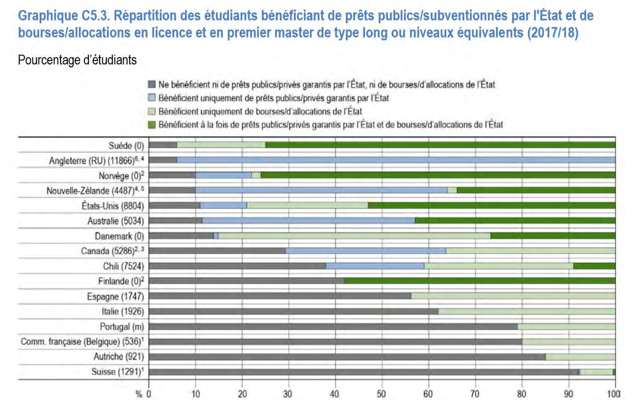 En Norvège, le pourcentage d’étudiant·e·s bénéficiant d’une aide financière était de 90% en 2017-20182. Cela s’explique par la présence d’un prêt étudiant à taux 0. En effet, les jeunes norvégien ne s peuvent bénéficier de 1.150€ par mois sans conditions. Mieux encore, si iels obtiennent leur diplôme, la somme à rembourser est réduite de moitié. Mais la perspective de devoir rembourser même la moitié de ce prêt peut être un frein pour des personnes ayant peu de ressources financières3 De plus, les jeunes sont soumis·e·s à de nombreux risques lors du passage de l’école à l’emploi tel que le chômage ou une situation précaire due au salaire bas ou à des contrats à courte durée4. Les prêts peuvent donc être difficile à rembourser et être lourd de conséquences pour les étudiant·e·s5