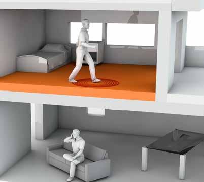 FOOTFALL SOUND TRANSMISSION IS CAUSED BY VIBRATIONS THAT PASS THROUGH THE SLAB, TRANSMITTING THE SOUND TO ROOMS BELOW. TO ELIMINATE FOOTFALL SOUND, A MAT IS LAID BETWEEN THE SLAB AND THE SCREED: MADE OF RESILIENT MATERIAL, THE MAT SEPARATES THE LOADBEARING STRUCTURE FROM THE FLOOR, PREVENTING THE TRANSMISSION OF VIBRATIONS.
