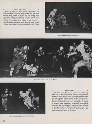 The Flyers made the trip to Cincinnati the following week with an eye toward finally defeating their perennial nemesis-Cincy's Bearcats. After a brilliant first half which saw Bob Michigan plunge through the line for two touchdowns and Timura shoot across for a third, the Flyers left the field at intermission with a 21-7 advantage. This display of offensive power was Dayton's largest point production of the season. The second half saw the tiring Flyers fall prey to the superior numbers of Bearcats. Cincinnati scored twice in the third quarter and once in the fourth to hand the Flyers their second defeat of the season.