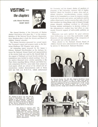 The Annual Meeting of the University of Dayton Alumni Association took place Dec. 7 on the campus. Members of the National Board, Chapter Repres en tatives, Members-elect to both the Alumni and Board of Athletic Control attended. The Alumni Secretary presented h er annual report. The Treasurer's report and progress made on th e Ke ttering Challenge Gift Program were given. An interesting report prepared by Mr. James J. Gilvary, ational Vice-President on the dialogue between the National Alumni Board and representatives of the student body was read by Mr. Donald Ruhl. At the request of National and Local Boards student rep resentatives were invited to attend meetings . Some of the matters discussed were: articles appearing in the Flyer News regarding Bishop O 'Boyle and Birth Control; compulsory R.O .T.C .; news leaks from campus to local papers which are critical of the school and administration; student demonstrations such as those held last Fall over R. 0 . T . C., which embarrassed