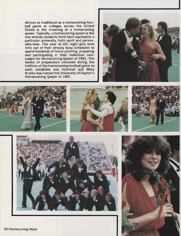 Almost as traditional as a homecoming football' game at colleges across the United States is the crowning of a homecoming queen. Typically, a homecoming queen is the one woman students think best represents a particular university, both spirit and personality-wise. This year at UD, eight girls took time out of their already busy schedules to spend hundreds of hours planning, preparing and partioipating in their individual campaigns for Homecoming Queen of 1981 . The weeks of preparation climaxed during the halftime of the homecoming football game as each candidate was honored and Mary Krutko was named the University of Dayton's Homecoming Queen of 1981.