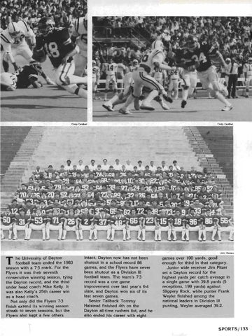 games over 100 yards, good enough for third in that category. Junior wide receiver Jim Pitzer set a Dayton record for the highest yards per c~tch average in a single game- with 39.8 yards (5 receptions, 199 yards) against Slippery Rock, while punter Frank Weyler finished among the national leaders in Division III punting. Weyler averaged 39.2_