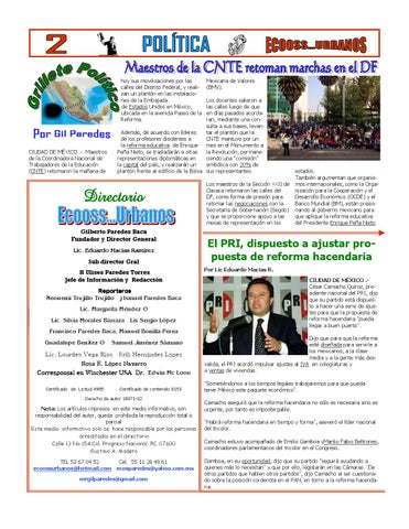 Nota: Los artículos impresos en este medio informativo, son responsabilidad del autor, queda prohibida la reproducción total o parcial Este medio informativo solo se hace responsable por las personas acreditadas en el directorio Calle 13 No 154 Col. Progreso Nacional PC. 07600 Gustavo A. Madero TEL 53 67 04 52 Cel. 55 11 28 49 61 ecoossurbanos@hotmail.com ecosparedes@yahoo.com.mx mrgilparedes@gmail.com