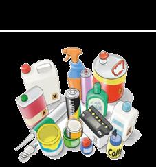 Basen, batterijen (www.bebat.be), bestrijdingsmiddelen, frituurolie of –vet, fondue-olie (www.valorfrit. be), gevaarlijk huishoudelijk afval met gemengde samenstelling, (verpakkingen van) giftige of bijtende producten, harsen en lijmen, lachgaspatronen, injectienaalden (in naaldcontainer), inkten en verven, kaarsen, motorolie (www.valorlub.be), röntgenfoto’s, schoonmaakmiddelen, solventen, stoffen en producten met kwik, zuren ...