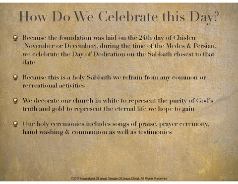 How Do We Celebrate this Day? Because the foundation was laid on the 24th day of Chisleu (November or December), during the time of the Medes & Persian, we celebrate the Day of Dedication on the Sabbath closest to that date Because this is a holy Sabbath we refrain from any common or recreational activities We decorate our church in white to represent the purity of God’s truth and gold to represent the eternal life we hope to gain Our holy ceremonies includes songs of praise, prayer ceremony, hand washing & communion as well as testimonies