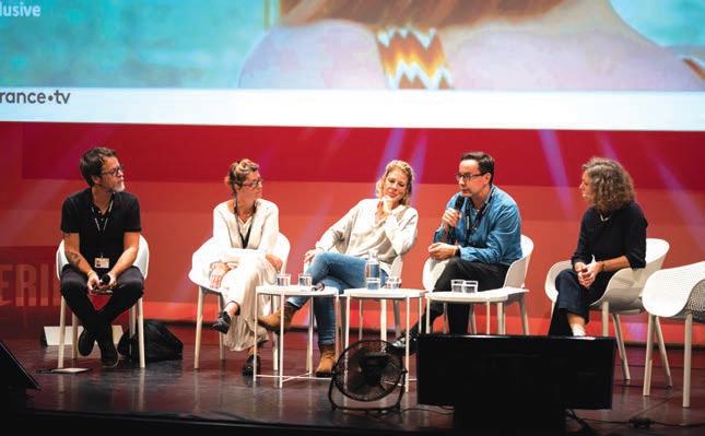 L'équipe de FTV en charge des acquisitions et coproductions internationales devant les professionnels réunis à Série Series. Pauline Dauvin, vice-présidente de Disney France en charge de la programmation, de la production et des acquisitions.