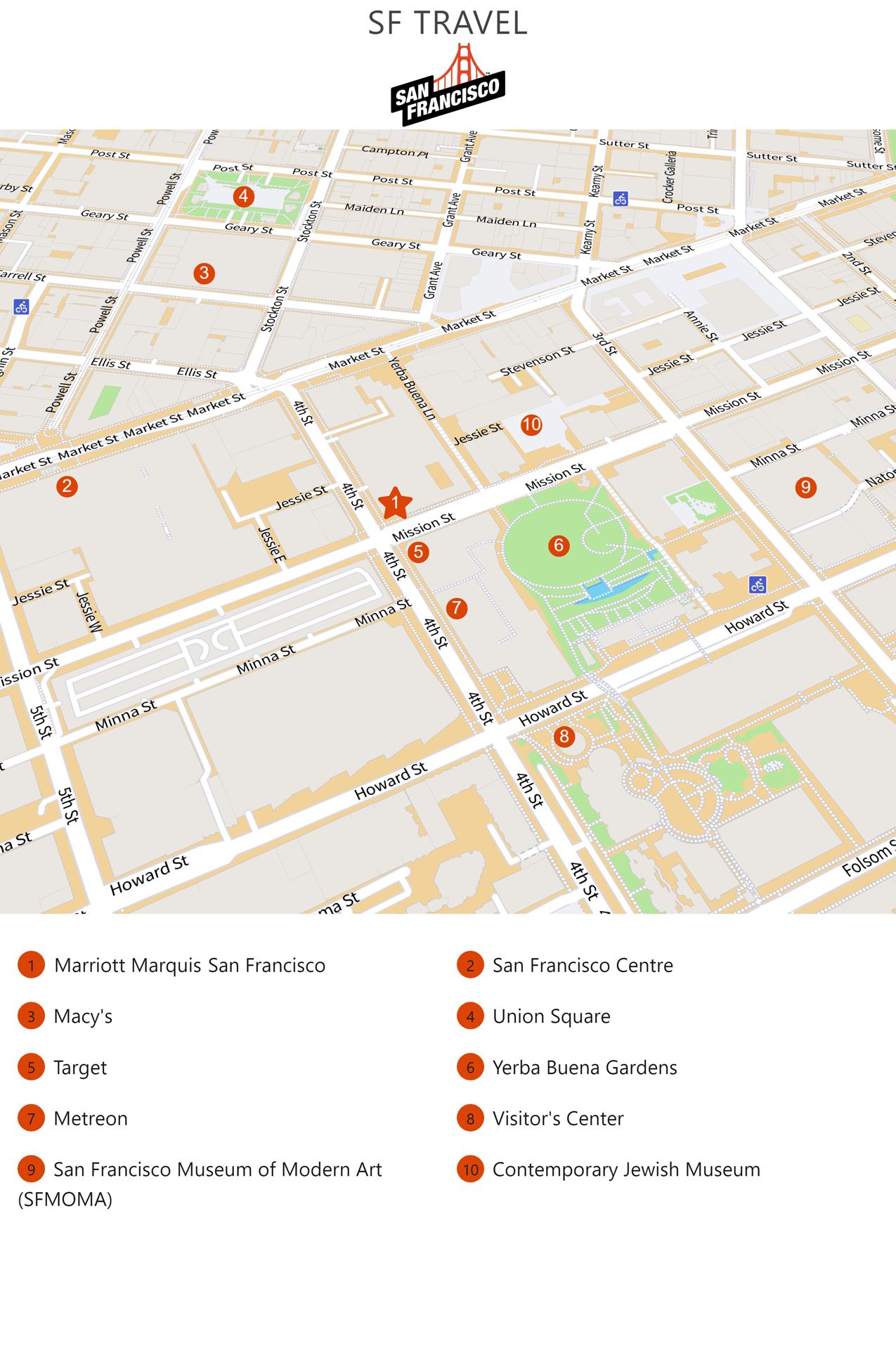 • Explore San Francisco. Take time to experience iconic San Francisco attractions like the nearby Yerba Buena Center for the Arts, Pier 39, and SoMa (South of Market Square district) and Union Square for shopping and dining.