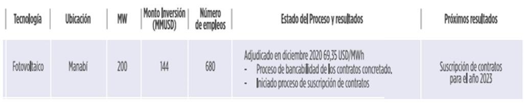 En el lado positivo de este año, podemos resaltar la construcción del proyecto eólico Minas de Huascachaca con 50 Mw, que al momento se encuentra concluido y entró en etapa de pruebas técnicas de generación. También se ha logrado avance en los procesos para incrementar nuestra oferta de generación, con el proyecto de energía fotovoltaica de El Aromo, así como el de energía eólica de Villonaco 3, que al ser proyectos que tienen tiempos de construcción relativamente cortos, serán de gran apoyo al sector eléctrico.
