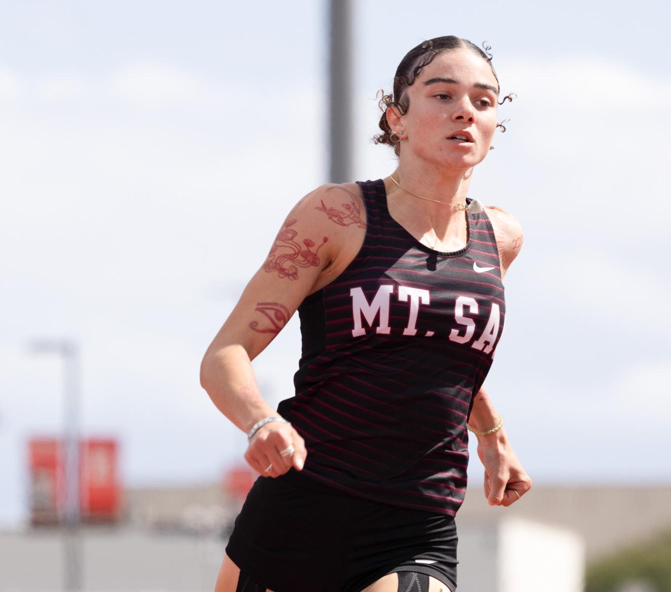 Dropping to her knees and crying tears of joy after her race, Leila Champion of the Mounties lived up to her surname by capturing the conference title in the women’s 100-meter dash, recording a personal best of 11.97 seconds in the event.