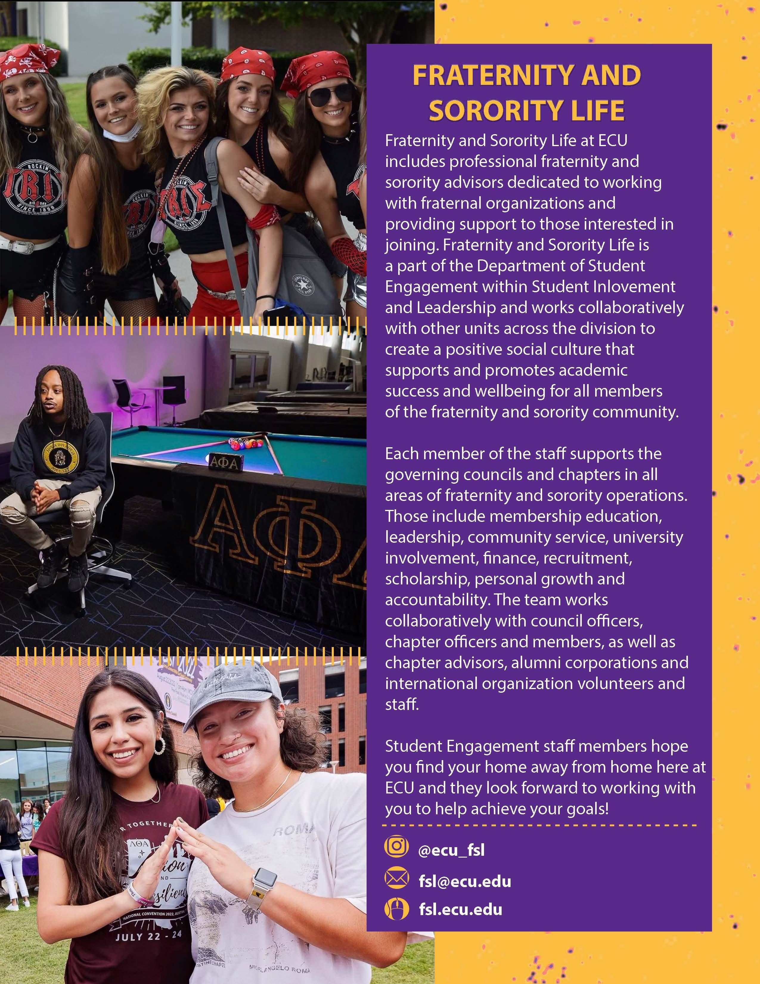 ECU's fraternity and sorority community provides a diverse selection of social opportunities for members varying from brotherhood and sisterhood events to social functions between organizations. Friendship is a core value of fraternities and sororities, and groups work to provide events and activities that promote relationshipswithin the chapter and in the entire fraternity and sorority community. Council members and general members from the various chapters of the community actively participate and serve on planning committees for student life events like Polar Bear Plunge, Greek Fest and other campus-sponsored events. These social opportunities help members form bonds and develop relationships that last far beyond their collegiate years.