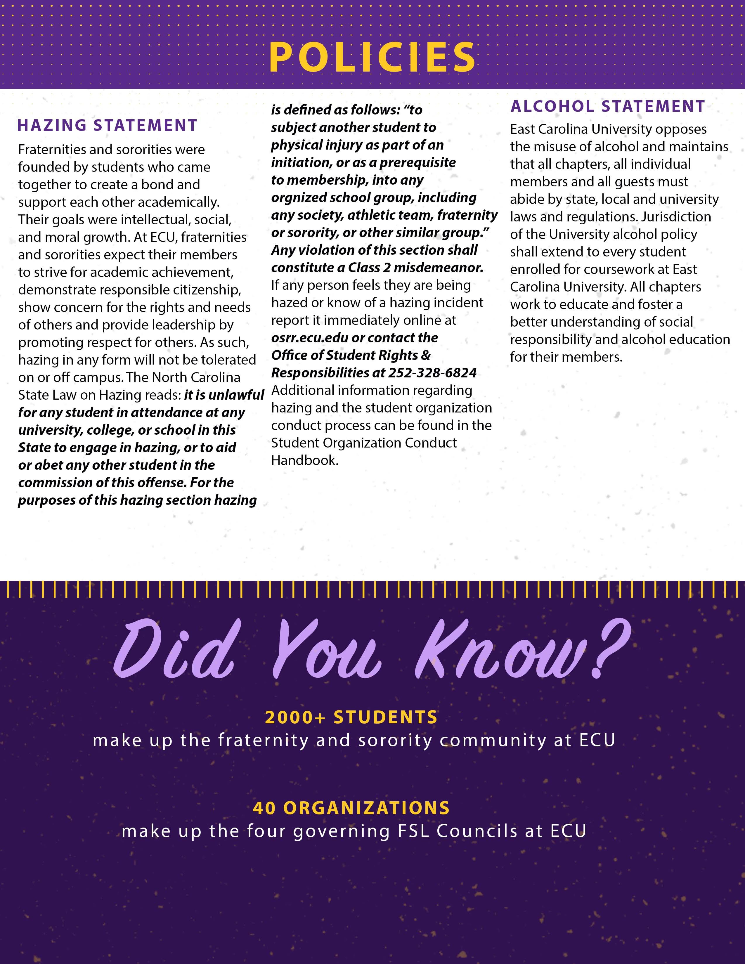 It's important to understand that hazing at East Carolina University WILL NOT be tolerated and all students should feel safe joining and maintaining membership. However, hazing can occur in any student organization, including Greek organizations. If you ever feel that your student may be participating in inappropriate activities regarding hazing, encourage them to complete an incident report with ECU's Office of Student Rights and Responsibilities.