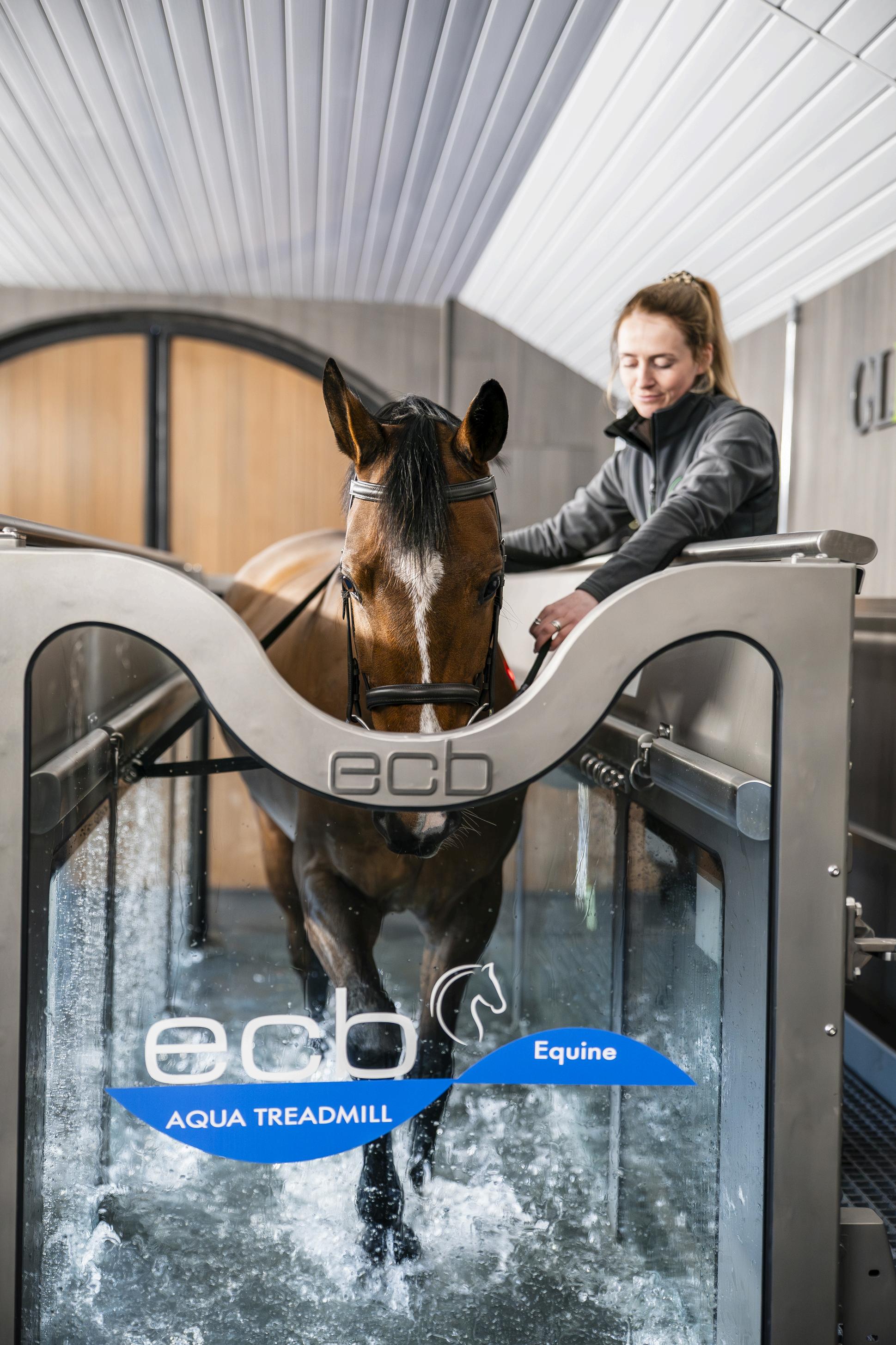 ·ECB Water Treadmill - The ECB Water Treadmill is a highly effective and fully customisable piece of equipment designed tosupporteachhorse’sindividualneeds.With adjustable water height, incline, and speed, wecantailoreverysessiontotargetspecific goals whether it’s improving overall fitness, rebuildingstrengthafterinjury,oraddressing muscle weakness and asymmetry. The buoyancy of the water reduces concussion onthejointsandlimbs,makingitasafeand low-impact way to develop topline, improve stride length, and enhance cardiovascular health It’s a brilliant tool for both performance horses and those in rehabilitation.