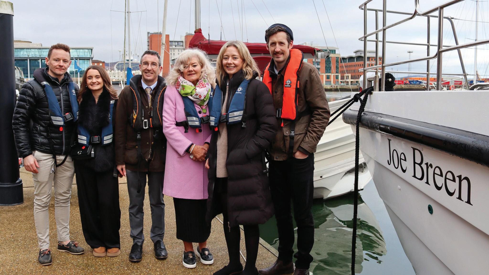 Family, friends and ex-colleagues of the late Joe Breen OBE, met at Belfast Marina in Abercorn Basin for the renaming of the Department’s new survey vessel to the ‘Joe Breen’.