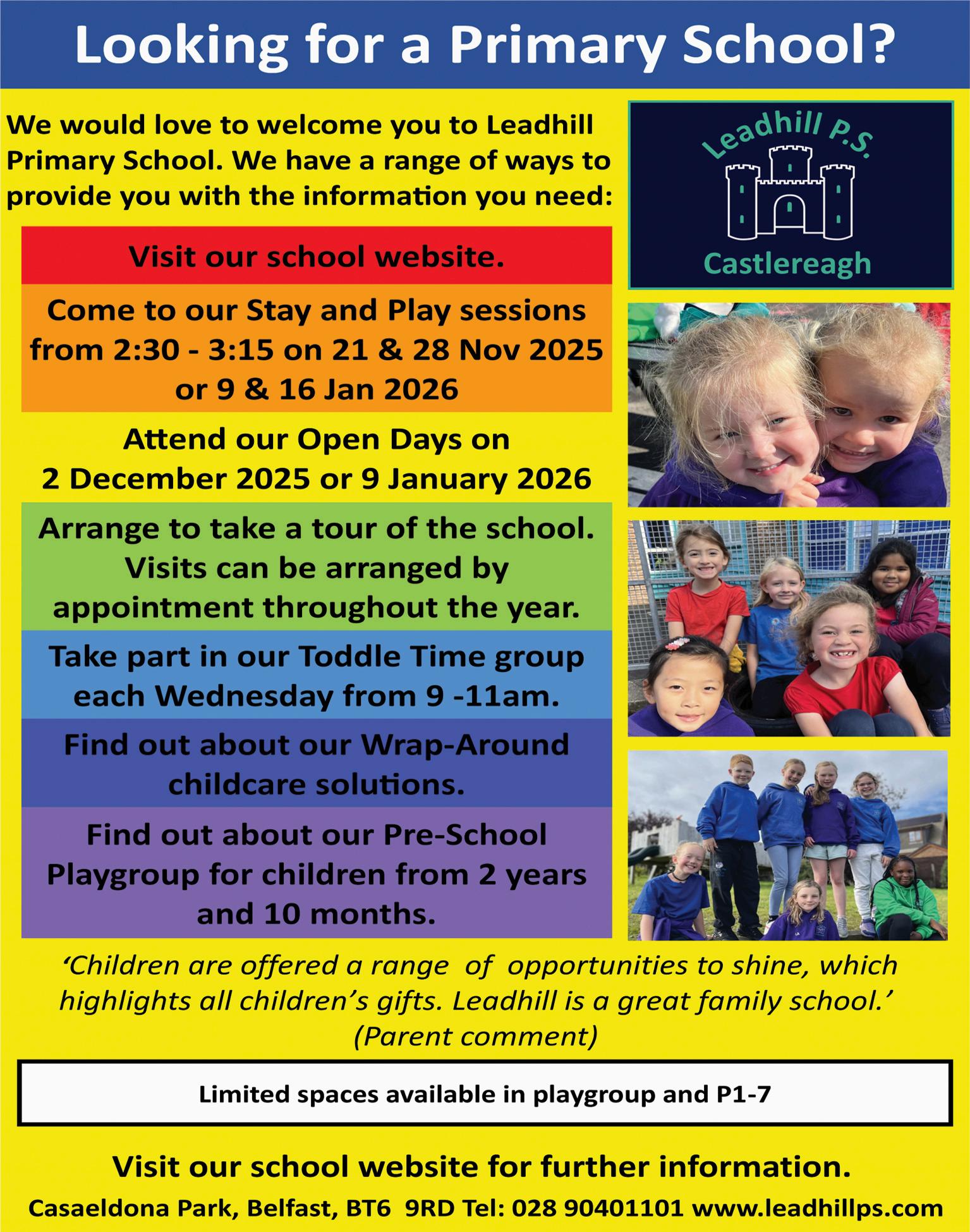 Visiting a school is an important step in choosing a school, and this personal touch reflects Leadhill’s approach in supporting families. As a smaller, nurturing school in the Castlereagh area, working to support parents and children is central to what Leadhill has to offer Leadhill parents recognise the value of a primary school setting where every adult knows every child Leadhill welcomes and supports children from all backgrounds and promotes inclusivity and child-centred approaches