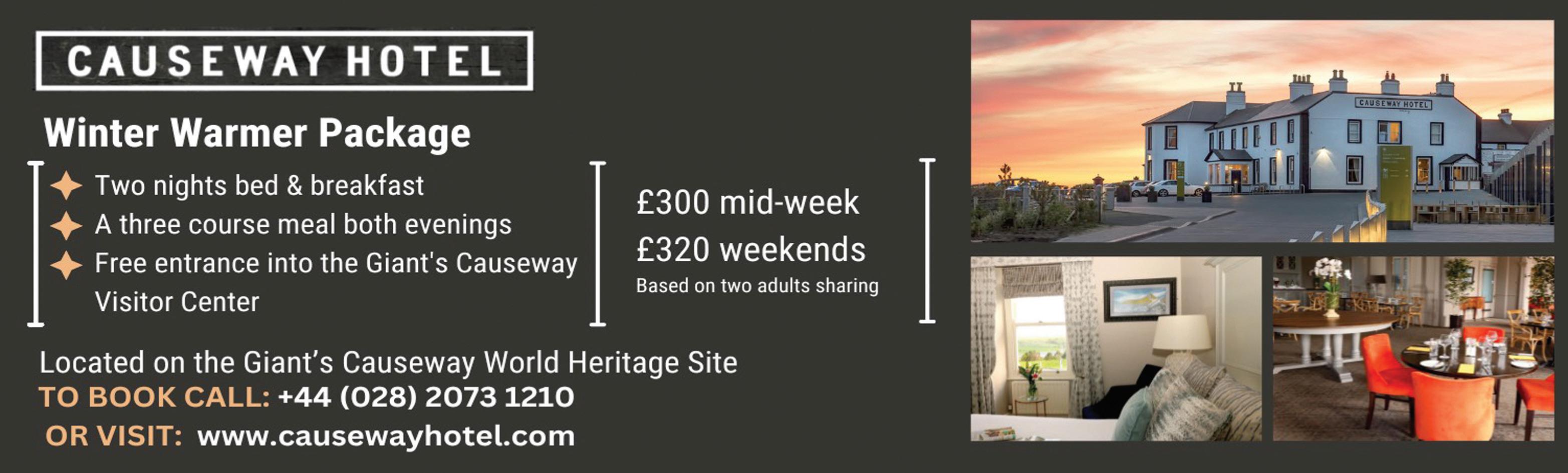 3* Hotel of the Year, Duty Manager of the Year, Excellence in Service and Great Irish Breakfast are among the prestigious accolades awarded to the hotel by The Irish Hotel Awards 2023. Our Winter Warmer package, priced at £300 midweek and £320 on weekends for two nights, ensures an escape into nature’s rich hues. Enjoy accommodation, breakfast, and indulge in an exquisite three-course meal both evenings in our 1836 Ballroom restaurant. Located on the Giant’s