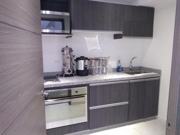 Salón de reuniones equipado con cocineta para el servicio de cafetería (incluye menaje), baños, y equipos tecnológicos como sonido, video beam, con capacidad y distribución para 35 personas en tipo aula y 50 personas en tipo auditorio y sala de juntas.