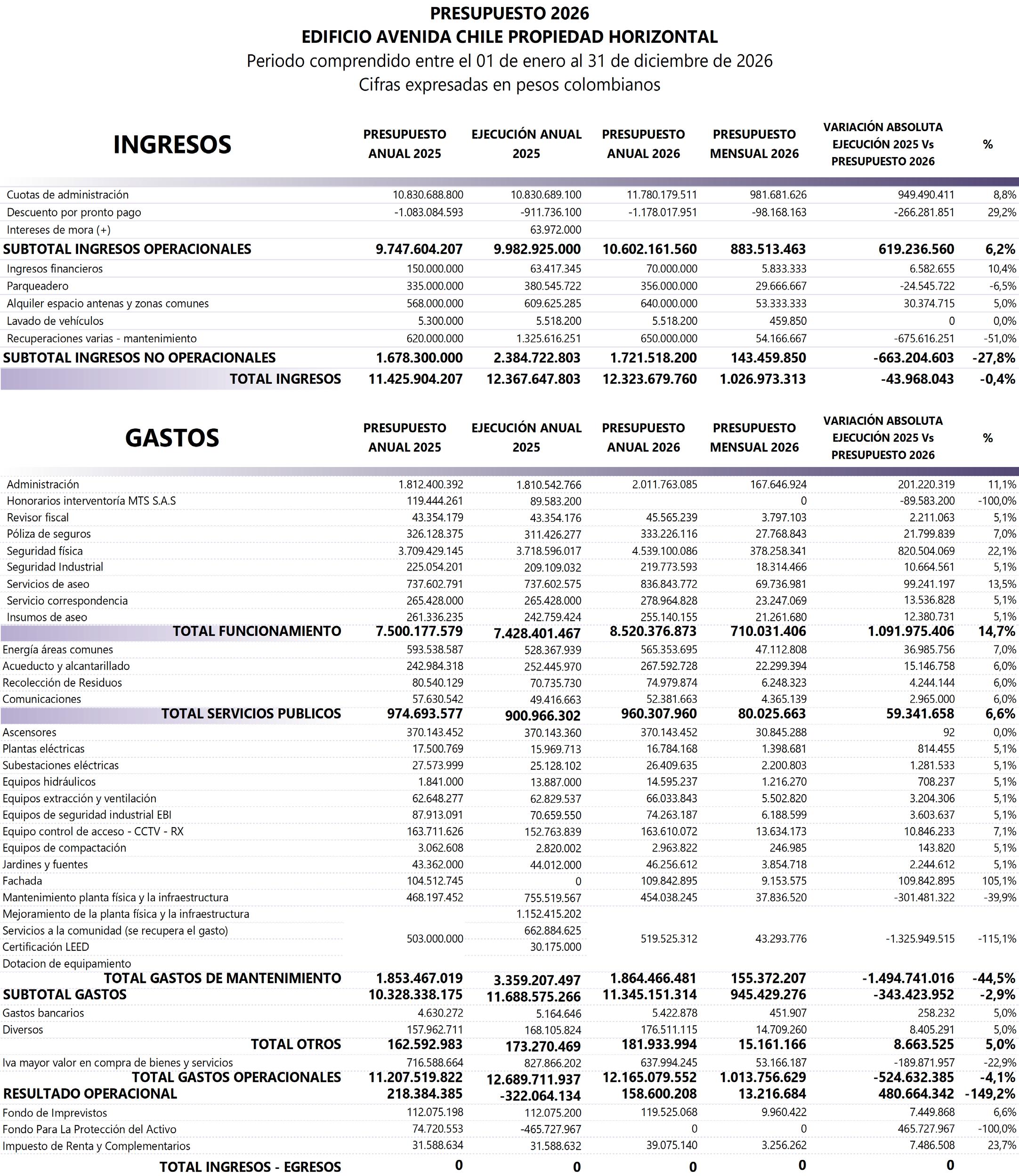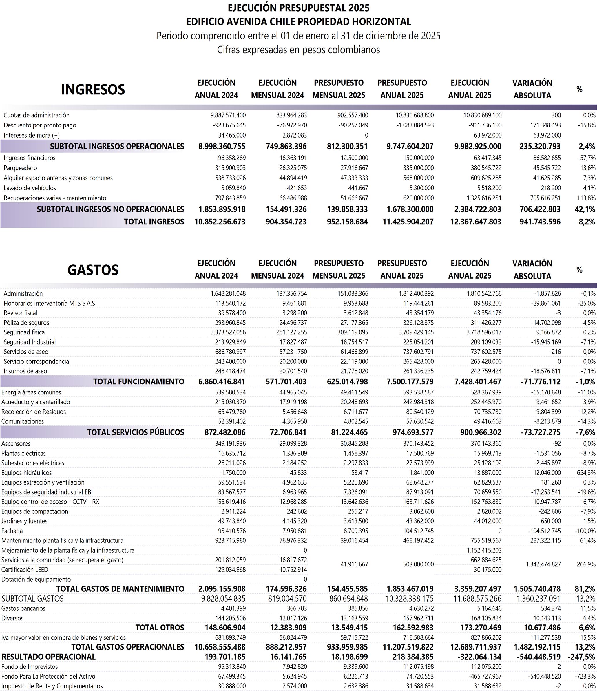 El informe de cierre de gestión del año 2025 del Edificio Avenida Chile P.H. consolida el desempeño organizacional, financiero y ambiental del inmueble en un contexto que exige modelos de gestión resilientes, eficientes y sostenibles. Durante el periodo, la copropiedad se fortaleció en la gestión con propósito, la adaptación continua y la disciplina en manejo eficiente de los recursos, enfrentando agilmente los diferentes desafios como la reforma laboral, la alta rotación de personal y el incremento de precios.