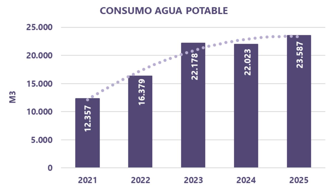 Reconociendo que la gestión del recurso hídrico trasciende de la gestión administrativa y que la gobernanza del consumo de agua es un esfuerzo comunitario, compartimos la importancia de adoptar prácticas responsables en el uso de este recurso vital. En 2025, el consumo total de agua potable fue de 23.587 m³, lo que representa un incremento de 1.564 m³ en comparación con el año anterior. Este aumento se atribuye a ocupación casi total del inmueble y el correspondiente aumento de la población, y es directamente proporcional a la disminución en vacancia.