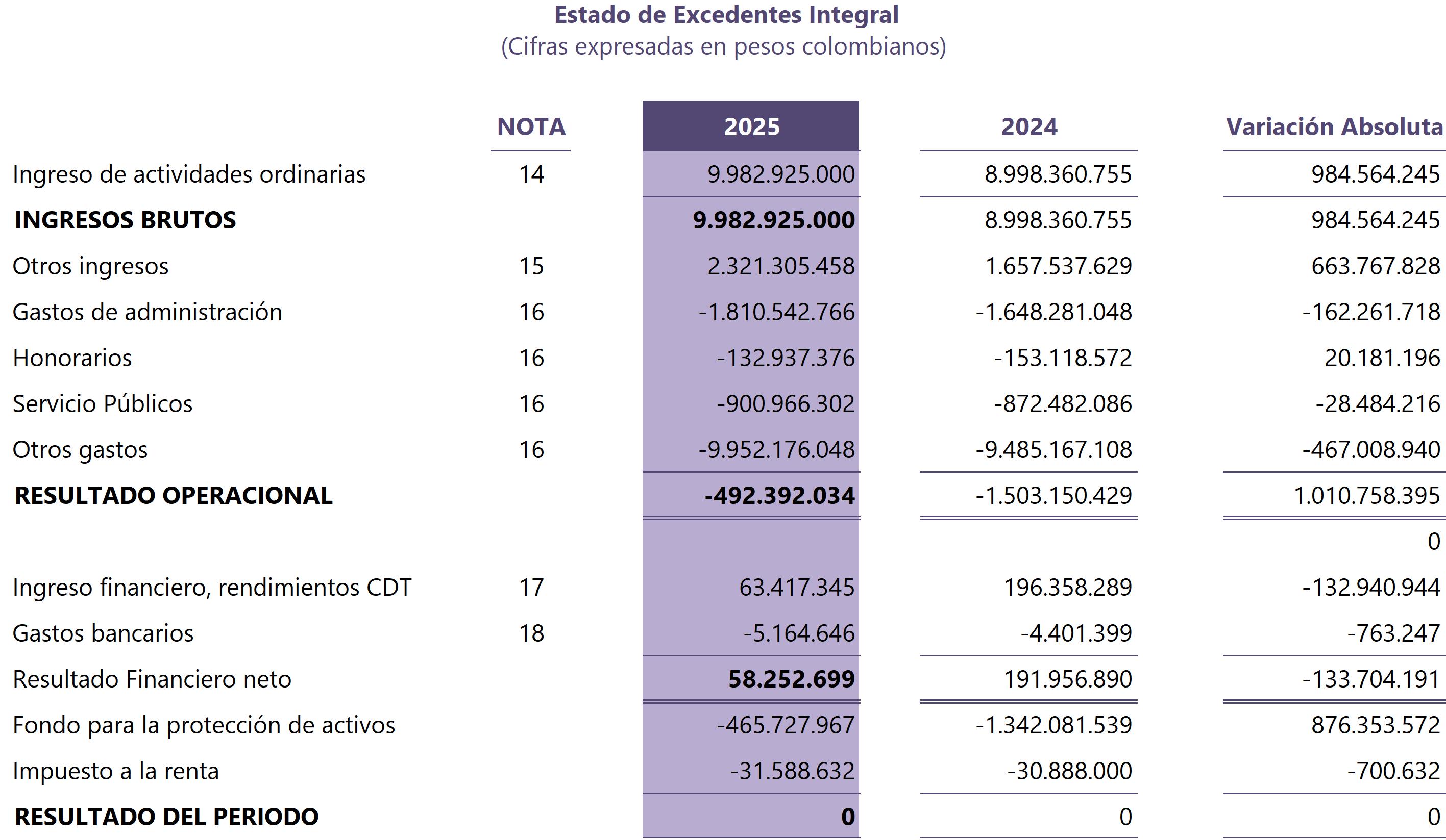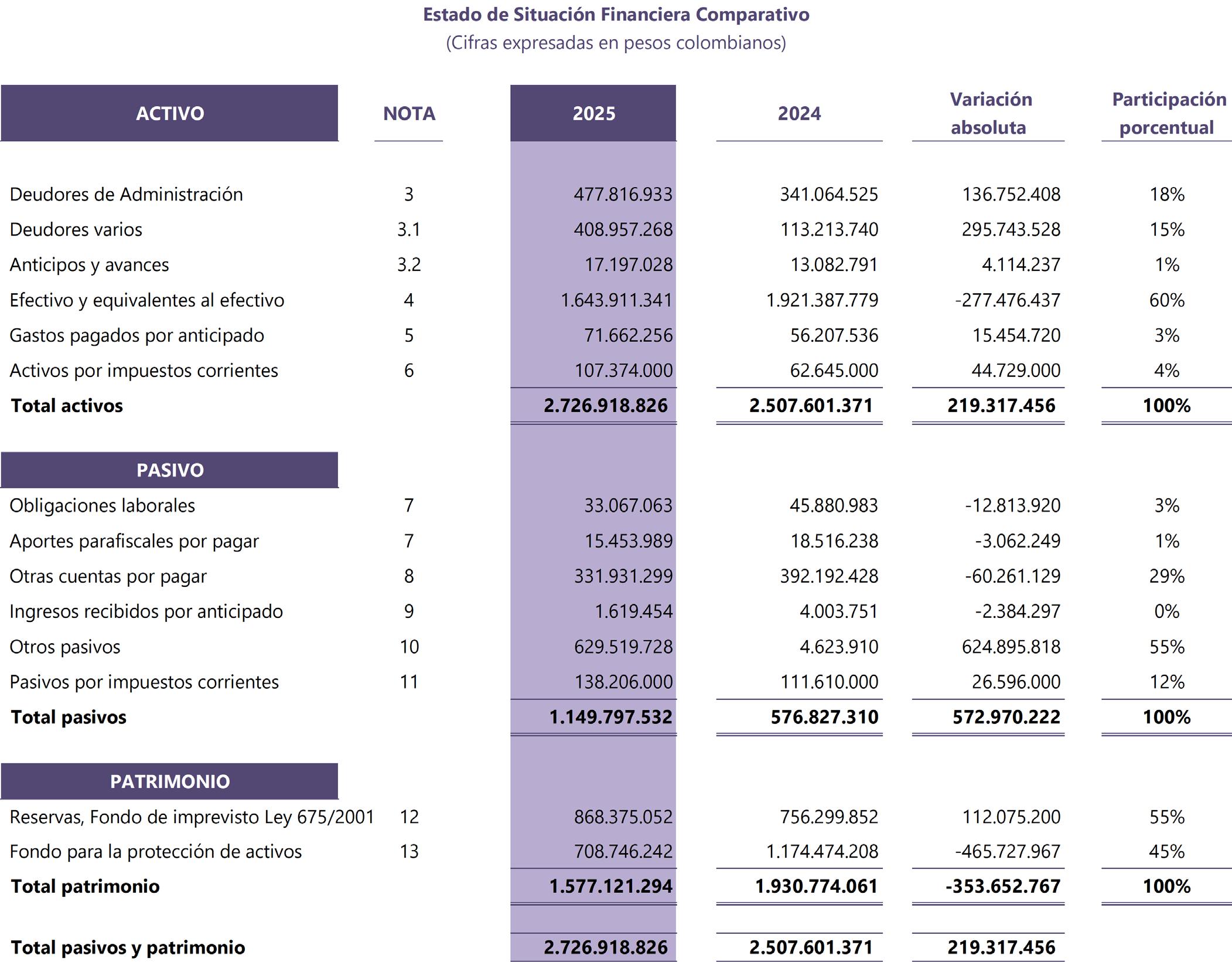El consejo de administración y la administración ponen a consideración de los señores asambleístas los Estados Financieros a diciembre 31 de 2025, los cuales han sido preparados conforme a los principios contables aplicables y las normas vigentes en materia financiera.