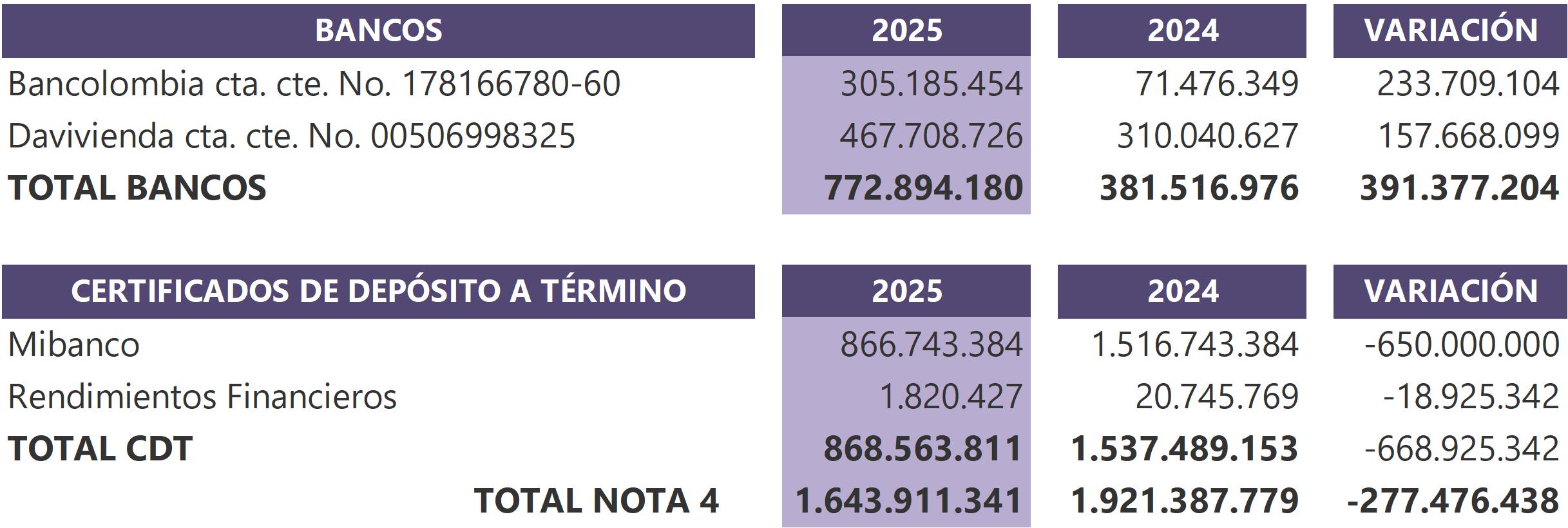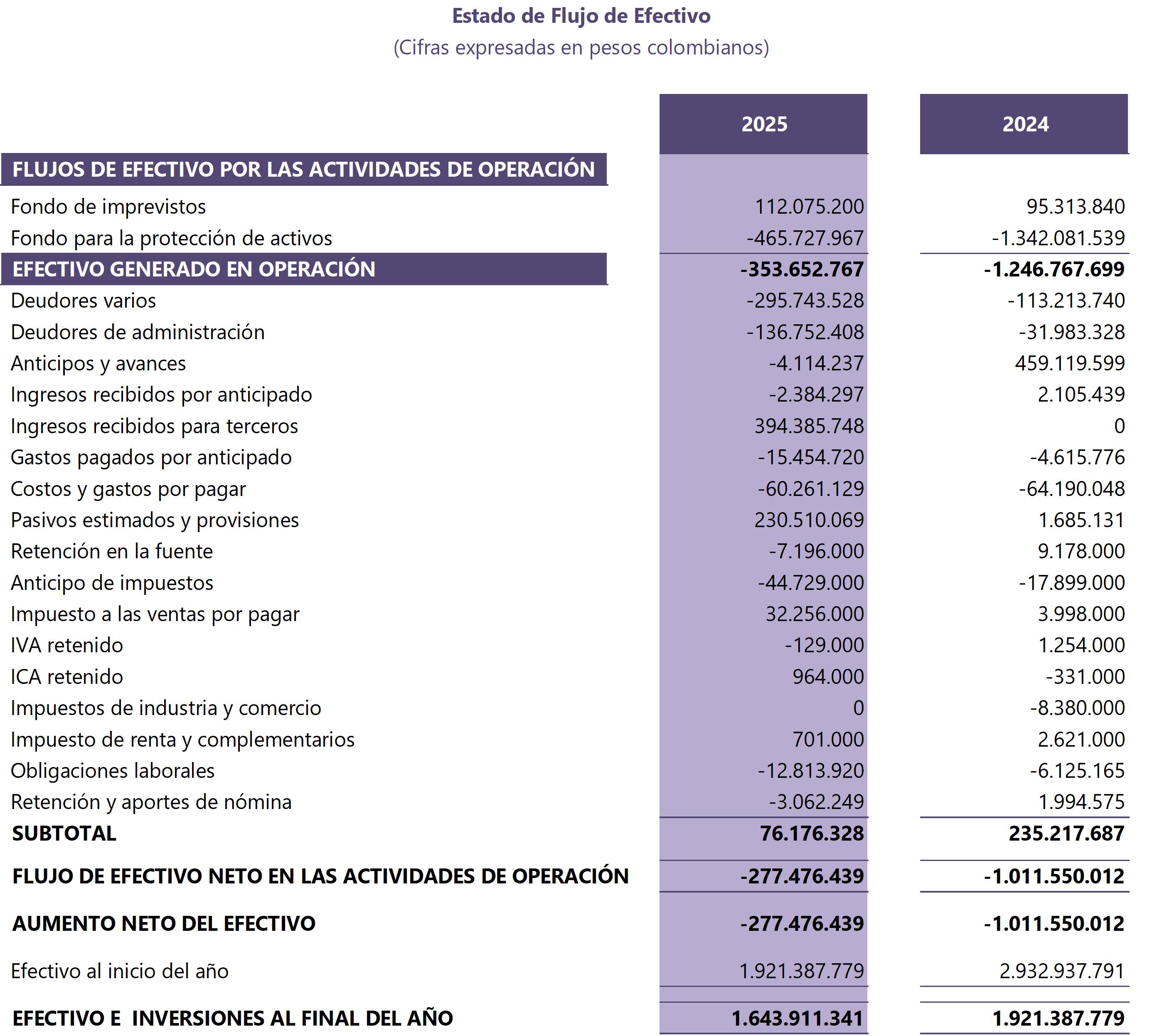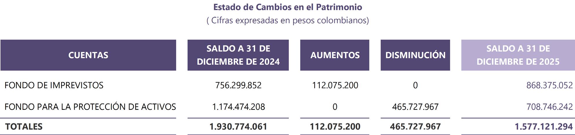 Los Estados Financieros del año muestran razonablemente los hechos económicos resultantes, el Estado de la Situación Financiera Comparativa se ve el aumento del Activo en 8,7% $219.317.456, terminando el 31 de diciembre de 2025 en $2.726.918.826, frente a $2.507.601.371 de año anterior, si bien el Efectivo y Equivalente al Efectivo disminuye en 14,4% $277.476.437, los recursos están en Deudores Varios que son los anticipos girados para la remodelación de los baños a cargo de la Fundación Julio Ramírez Jhons y el Banco Mundial por valor de $407.055.547 (ver nota 3.1) estos recursos retornaran durante el primer trimestre del año 2026.