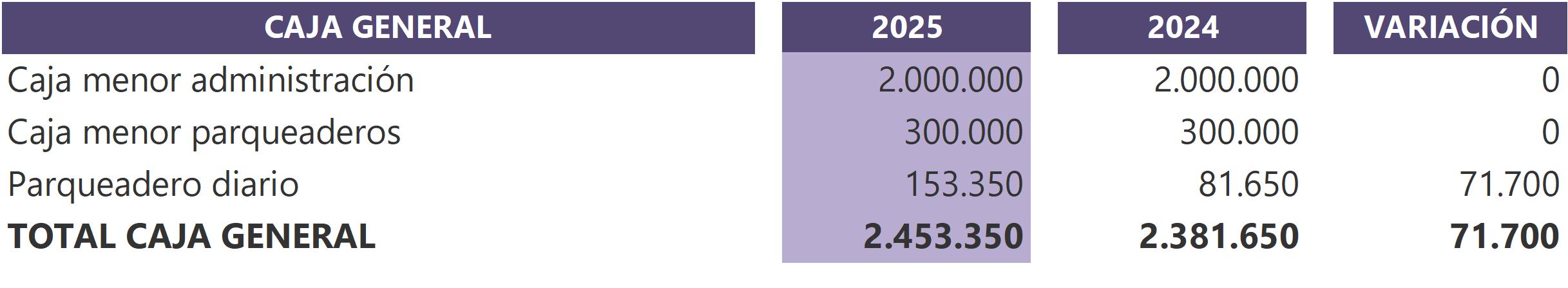 El fondo fijo de caja menor para el año es de $2.000.000 teniendo en cuenta que muchos de los gastos menores no superan $200.000. El saldo de la caja principal de administración está compuesto por: