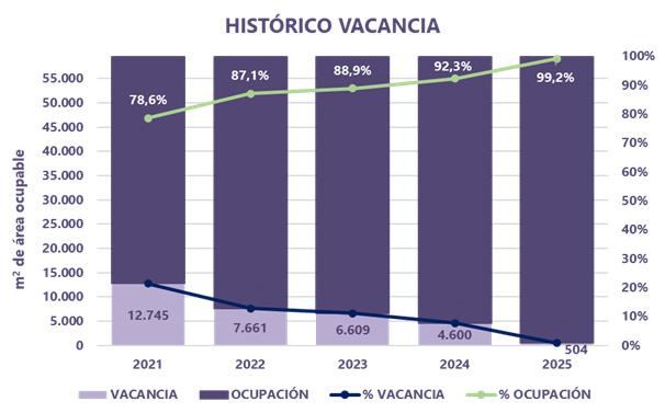 No ajeno a lo anterior, la vacancia del edificio inició el período con un 7,7%; no obstante, gracias a una gestión eficiente durante el año 2025, esta se redujo de manera significativa hasta cerrar en apenas un 0,8%, consolidando la ocupación casi total del inmueble. Este resultado evidencia la alta demanda, el adecuado posicionamiento del edificio en el mercado y su capacidad para generar estabilidad operativa y mayores beneficios económicos para la copropiedad.