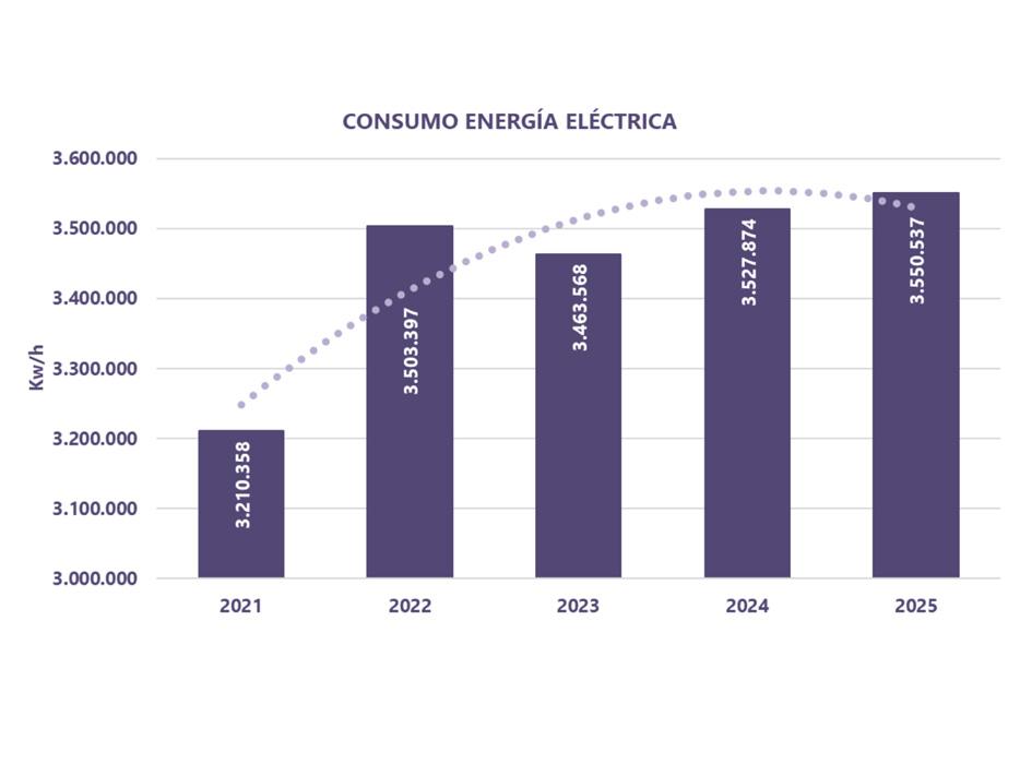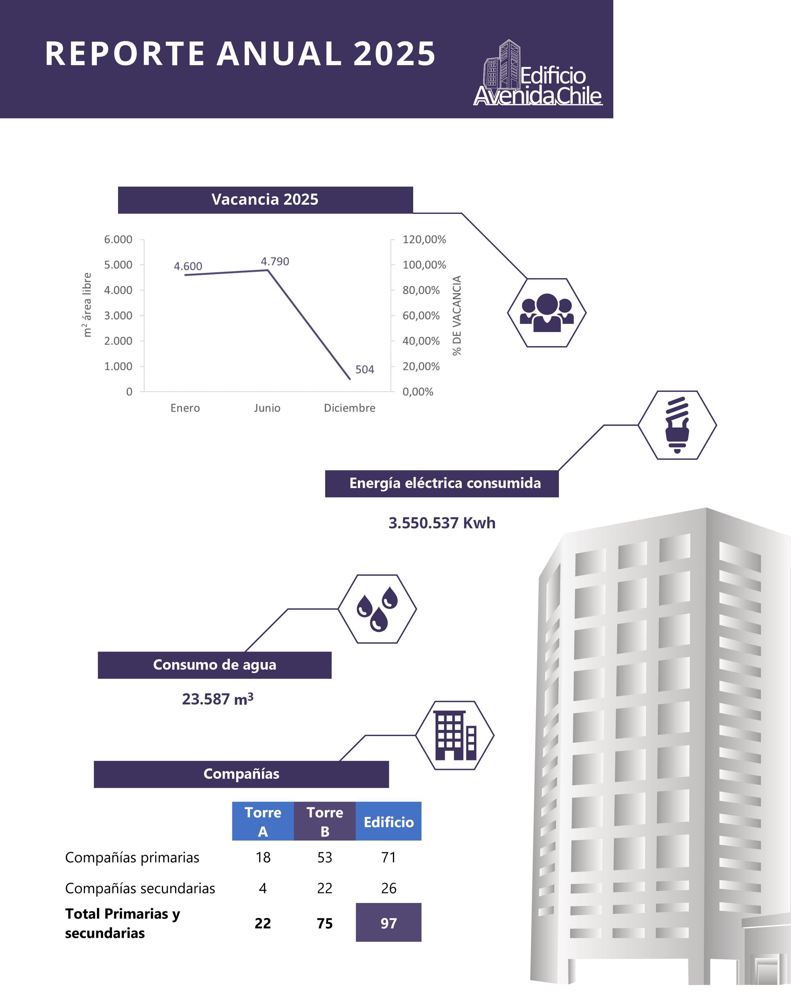 Durante el año 2025 el consumo de energía continuó con tendencia a la alza atribuido a la mayor ocupación del inmueble, para las zonas comunes fue de 741.307 KW/h y en las zonas privadas 2.809.230 KW/h con un costo anual de $2.509 millones de pesos.