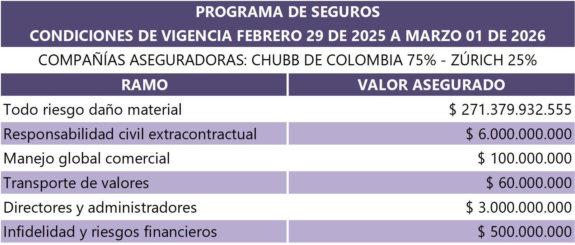 El programa de seguros, en su renovación, se pactó con los respectivos valores asegurados establecidos para cada cobertura.