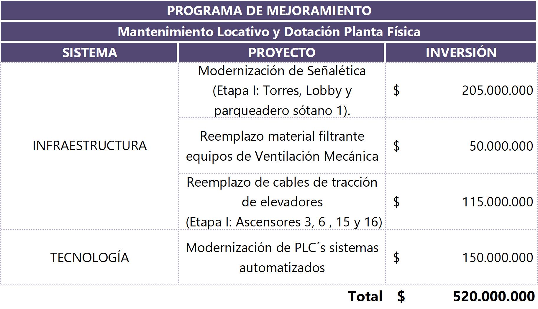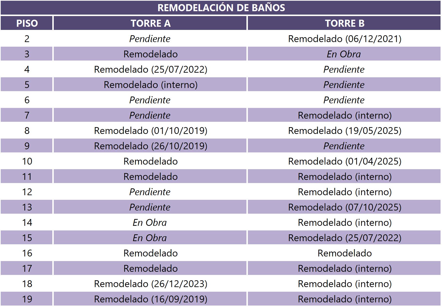 En el año 2025 se remodelaron los baños de los piso 8,10 y 13 de la torre B y se dio inicio a la obra de los pisos 3 de la torre B, 14 y 15 de la torre A, completando 24 pisos remodelados desde el año 2019 que se inició este proyecto, quedan pendientes los pisos 2,6,7,12 y 13 de la torre A y los pisos 4,5,6 y 9 de la torre B.