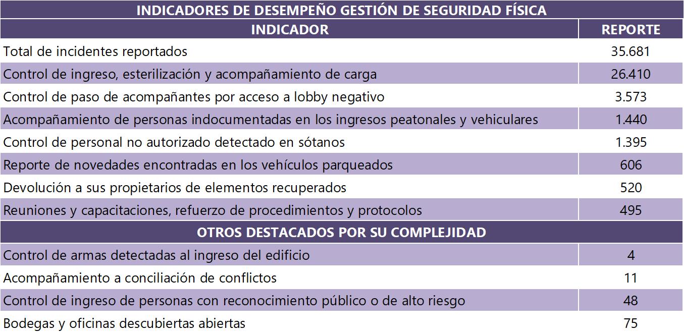 Durante el periodo evaluado, el servicio se prestó de manera continua y eficiente, las diferentes actividades desarrolladas a lo largo del año, el cumplimiento de los procedimientos establecidos y la respuesta efectiva ante situaciones de riesgo, permitieron lograr los objetivos trazados, los niveles de riesgo se mantuvieron estables, teniendo en cuenta que no se materializó ningún siniestro o incidente relevante que generara alguna afectación, garantizando así, la continuidad de la operación y prestando un servicio sin interrupciones, contribuyendo a mantener las condiciones adecuadas de seguridad y control.
