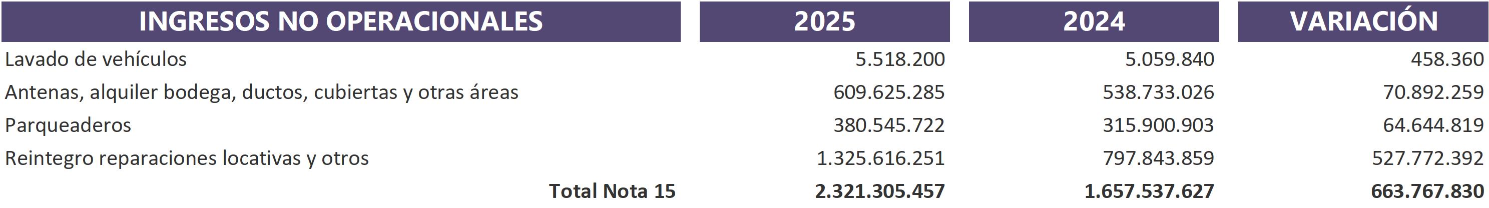 Comprende los ingresos provenientes de transacciones diferentes a los del objeto social o giro normal de los negocios de la copropiedad e incluye, recuperaciones de deducciones e ingresos de ejercicios anteriores.