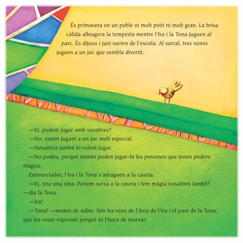 —Ei, podem jugar amb vosaltres? —No, estem jugant a un joc molt especial. —Nosaltres també hi volem jugar. —No podeu, perquè només poden jugar-hi les persones que tenen poders màgics. Emmurriades, l’Ira i la Tona s’amaguen a la caseta. —Ei, tinc una idea. Portem sorra a la caseta i fem màgia nosaltres també? —diu la Tona. —Ira! —Tona! —senten de sobte. Són les veus de l’àvia de l’Ira i el pare de la Tona, que les estan esperant perquè és l’hora de marxar.