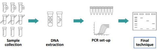 (b) Polymerase chain reaction (PCR) is a technique used to amplify small amounts of a DNA sequence of interest, into larger more detectable quantities. The DNA must first be extracted from a sample before PCR can be carried out and the results analysed. The main stages of this process are shown in the diagram below.