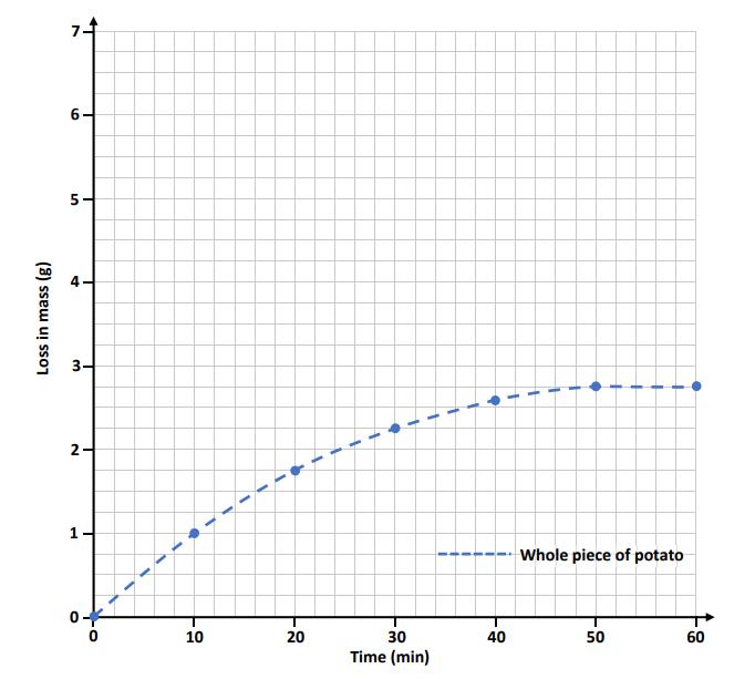(iv) The student measured the rate of osmosis by measuring the loss in mass of the potatoes every 10 minutes for 60 minutes. The results of the investigation were presented in the table below. The student plotted the results for the whole piece of potato, as shown in the graph below.