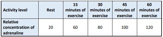(i) Name the gland A that produces adrenaline. A scientist investigated the effect of exercise on blood adrenaline concentration. Their data is shown in the table below.
