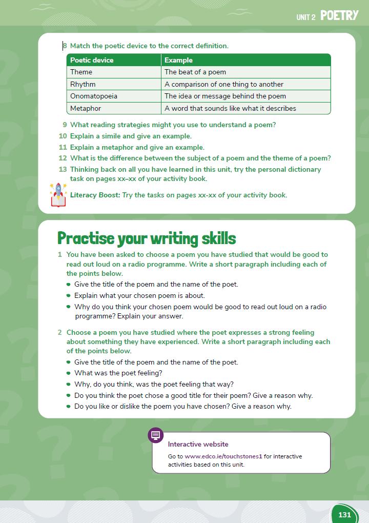 Teachers and students can access the New Touchstones 1 interactive e-book at www.edcolearning.ie, plus a bank of free digital resources, including: