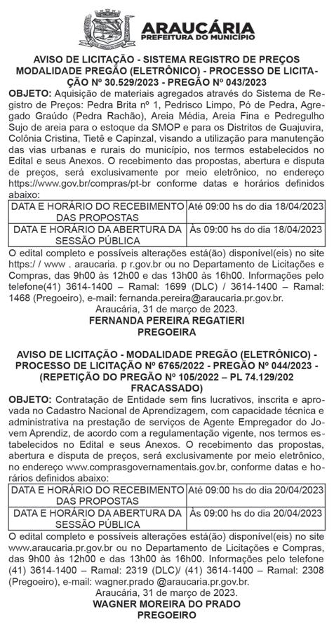 Publicidade Legal grupor3a.com 12 Editora Jornal do Ônibus Curitiba, segunda-feira, 3 de Abril de 2023 - edição 4.093 Publicação de editais, atas e balanços? Entre em contato no tel.: (41) 3263-2002 Continuação Balanço Patrimonial - MUNICIPIO DE ARAUCARIA - PREFEITURA DE CURITIBA