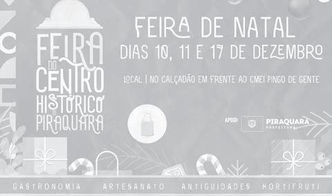 A tradicional Feira do Centro Histórico de Pi raquara será realizada em três datas nesse mês. Marcada para os dias 10, 11 e 17 de dezembro, o evento faz parte da pro gramação de natal de Pi raquara.