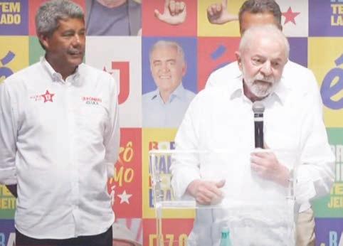 Após discursar nesse encontro, Lula partici pou de uma caminhada pelas ruas do Complexo do Alemão com o pre feito do Rio de Janeiro, Eduardo Paes. Do Rio de Janeiro, Lula seguiu para Salvador (BA). No final da tarde, ele e Je rônimo Rodrigues (PT), candidato ao Governo da Bahia, fizeram uma caminhada por diversas ruas da capital baiana. n
