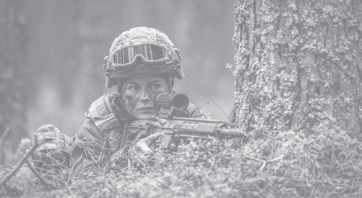 Uma soldado dinamarquesa escondida na floresta durante o exercício Crystal Arrow 2023. O exercício foi a Avaliação de Prontidão de Combate da OTAN (CREVAL) para o Grupo de Batalha eFP e mediu a capacidade de combate e integração na Brigada de Infantaria Mecanizada da Letônia. n