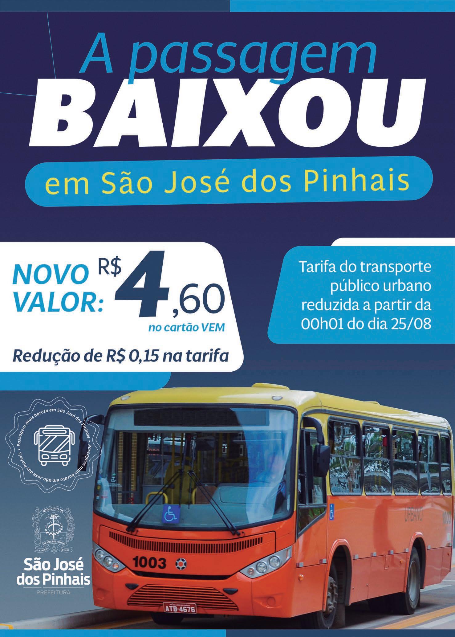 A partir da zero hora desta sexta-feira, a tarifa do transporte público em São José dos Pinhais será reduzida em R$ 0,15, passando de R$ 4,75 para R$ 4,60. Essa mudança beneficiará diretamente mais de 37 mil usuários. (Página 13)